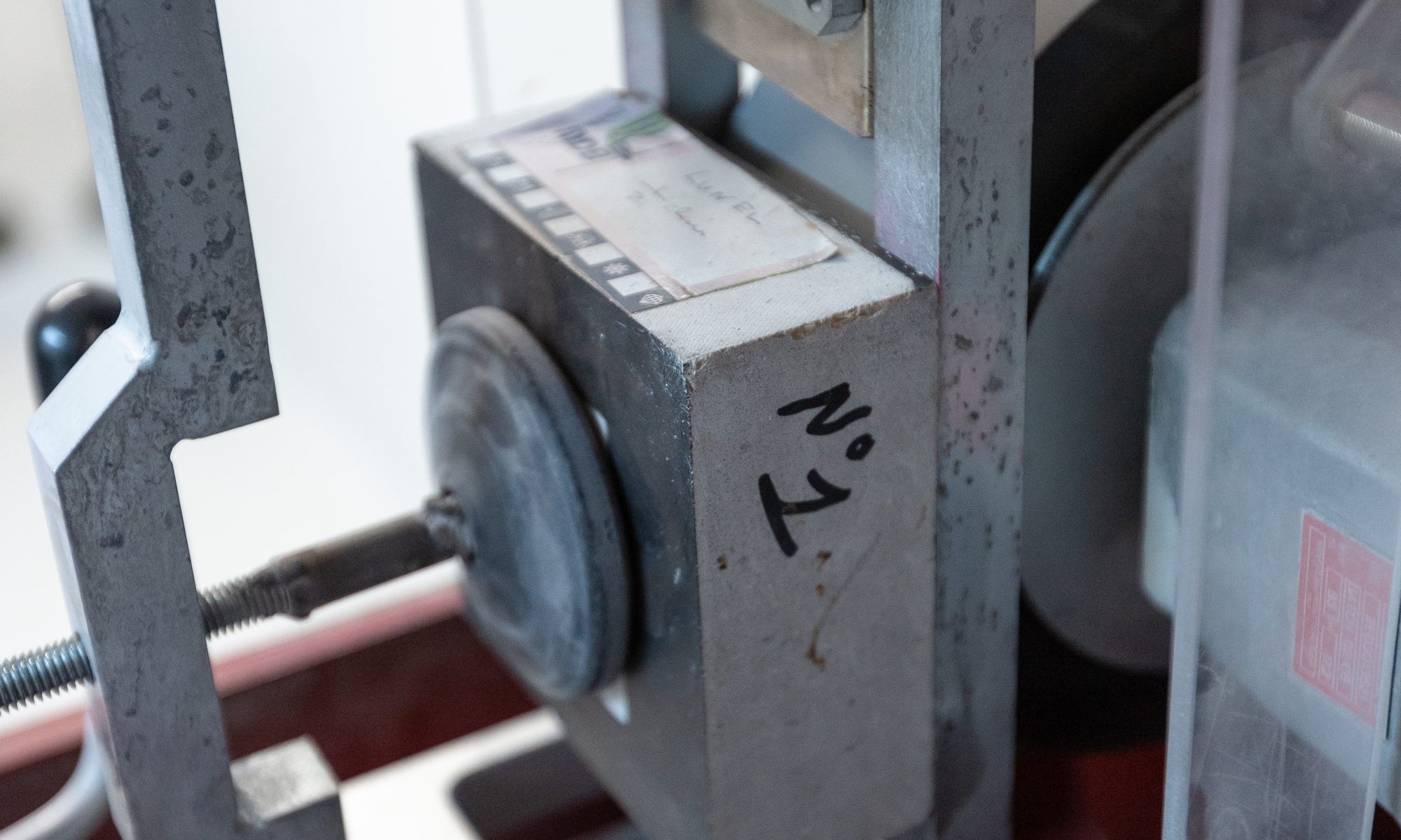 L’éprouvette doit se présenter sous la forme d’un produit entier ou d’un fragment découpé dans un produit, mesurant au moins 100 × 70 mm et comprenant la face supérieure dudit produit. Six échantillons sont nécessaires pour la réalisation de cet essai. Chaque éprouvette est soumis à l’abrasion d’une meule effectuant 75 rotations (en 60 ± 3 s) perpendiculairement à la surface à tester. Par la suite, la longueur de l’empreinte produite dans la pierre est alors mesurée.